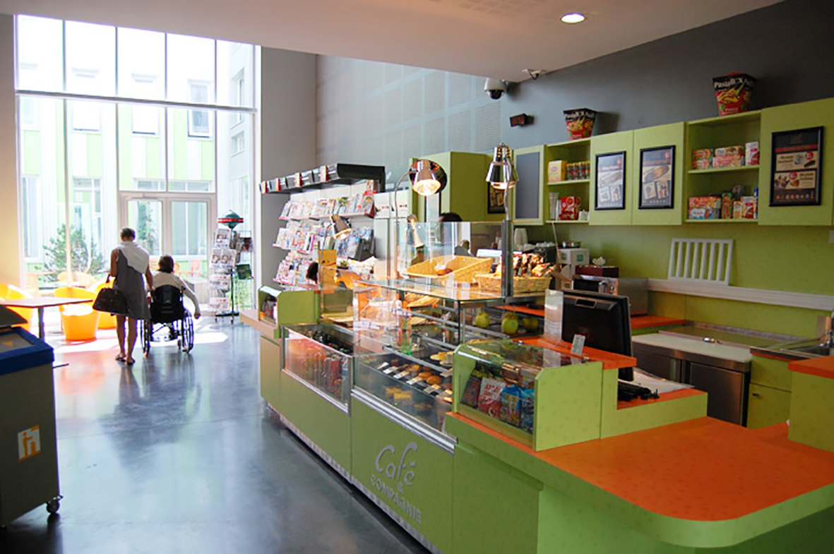 La cafétéria est située dans le hall d'accueil de la maternité.