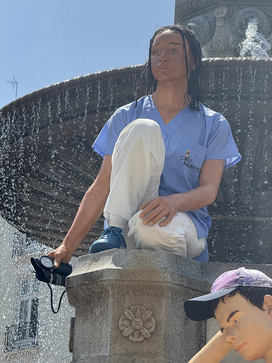 Le Voyage à Nantes juillet 2025 : Sur la place Royale, Kizzy, étudiante infirmière au CHU, devenue statue pour incarner les visages de Nantes d’aujourd’hui. L’artiste Willem de Haan a revisité la célèbre fontaine du 19e siècle : exit les allégories en bronze, place à 14 Nantaises et Nantais bien réels, choisis pour leur métier, leur engagement ou leur lien avec les transformations de la ville.