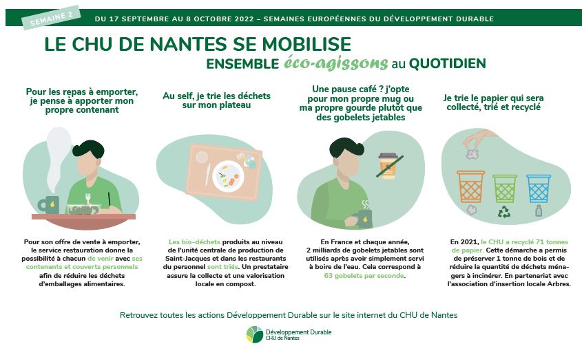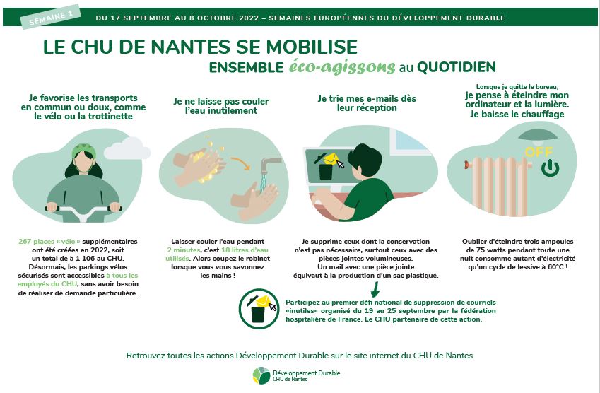 Les éco gestes sont des gestes simples, du quotidien, que tout le personnel du CHU peut mettre en place pour réduire son impact sur l’environnement. Ils peuvent se décliner dans différents domaines, comme les déplacements, les énergies, le numérique, les achats, les déchets…