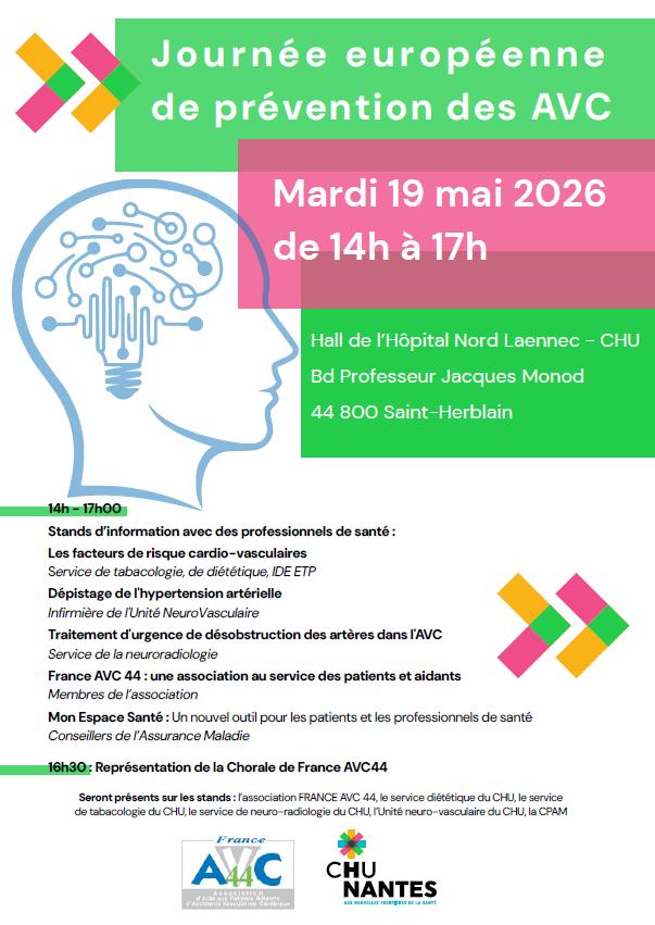 À l’occasion de la Journée européenne de prévention des accidents vasculaires cérébraux (AVC), le CHU de Nantes organise des stands d’information ouverts à tous, le 19 Mai de 14h à 17h, dans le hall de l’Hôpital Nord Laennec.
