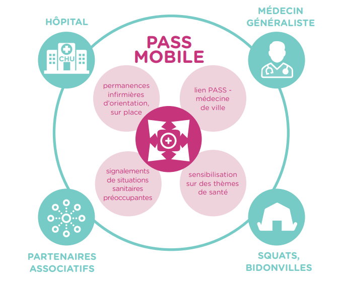 Equipe mobile PASS : actions hors les murs à destination des personnes en rupture avec le milieu du soin (habitat précaire, accueils de jours, centres d’hébergement d’urgence). Permanences soignantes, accompagnement individuel, travail partenarial avec le réseau médico-social.
