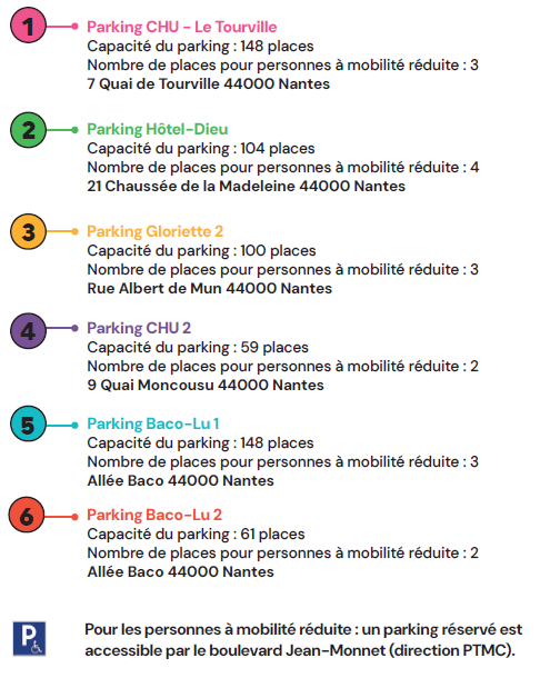 Vous venez en consultation ou en hospitalisation de jour, vous avez la possibilité de bénéficier d’un tarif spécial dans des parkings proches de l’établissement. Conformément aux orientations fixées dans le plan de mobilité du CHU et afin d’améliorer l’accessibilité des usagers à l’Hôtel-Dieu et à l’hôpital femme - enfant - adolescent, la direction a négocié avec Nantes métropole, pour les consultants fréquentant l’hôpital en ambulatoire (hôpital de jour et consultation de longue durée), un accès avec tarif privilégié aux parkings à enclos proches de l’établissement.