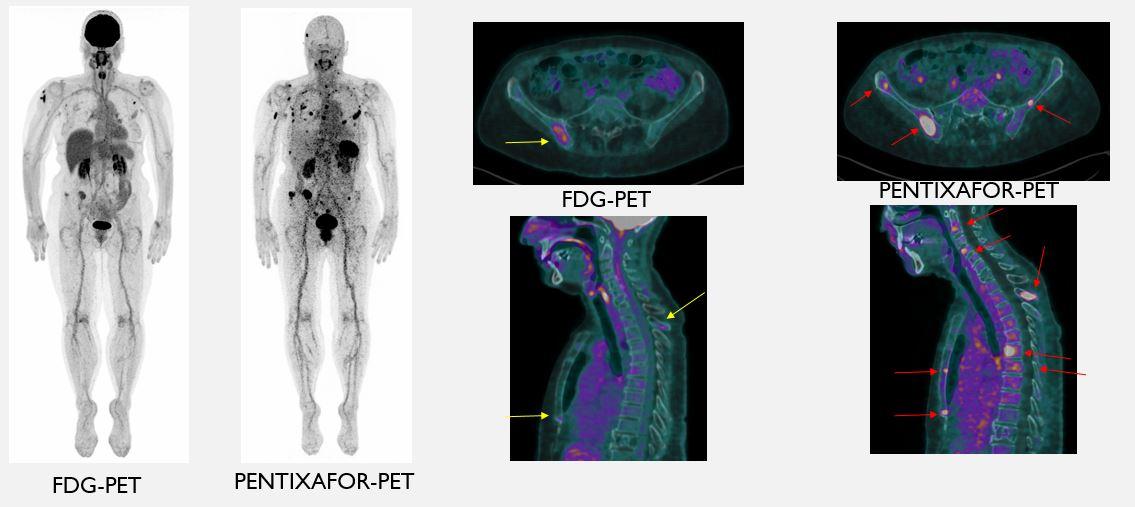 16 patients ont été déjà été inclus à Nantes et ont bénéficié de l’examen lors du bilan initial ou de rechute de leur maladie ainsi que, pour 6 d’entre eux, pour l’évaluation thérapeutique. Pour certains patients dont celui présenté ci-dessus, les images obtenues avec le [68Ga]Ga-PentixaFor montrent plus de lésions et des fixations plus intenses que ce que l'on observe avec le FDG. L'analyse définitive des 45 patients prévus nous permettra de définir plus précisément la place de ce nouveau traceur dans la prise en charge des malades porteurs de myélomes multiples.